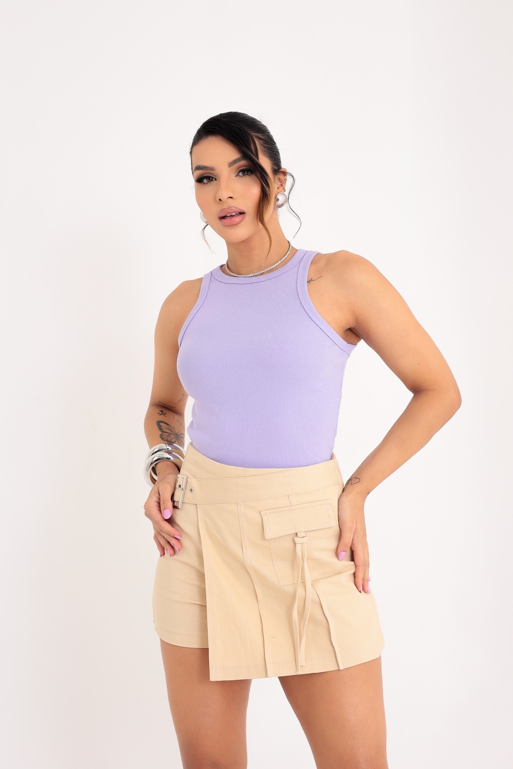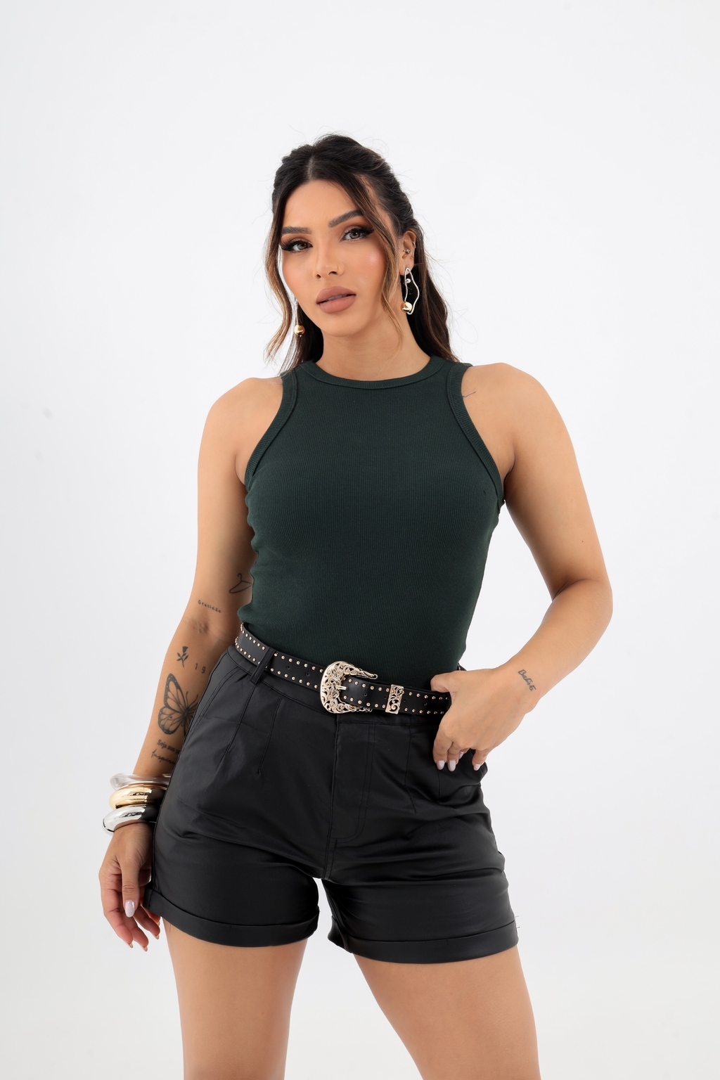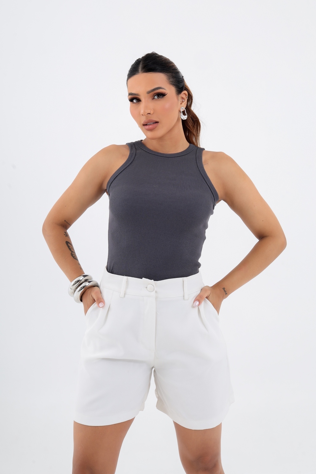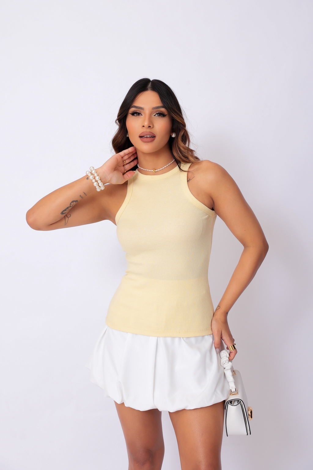 Eleve seu estilo com a Regata Básica! Confeccionada no tecido Ribana (50% algodão, 47% poliéster, 3% elastano), esta peça é o must-have no seu guarda-roupa. Versátil e atemporal, é perfeita para compor looks elegantes e descomplicados.