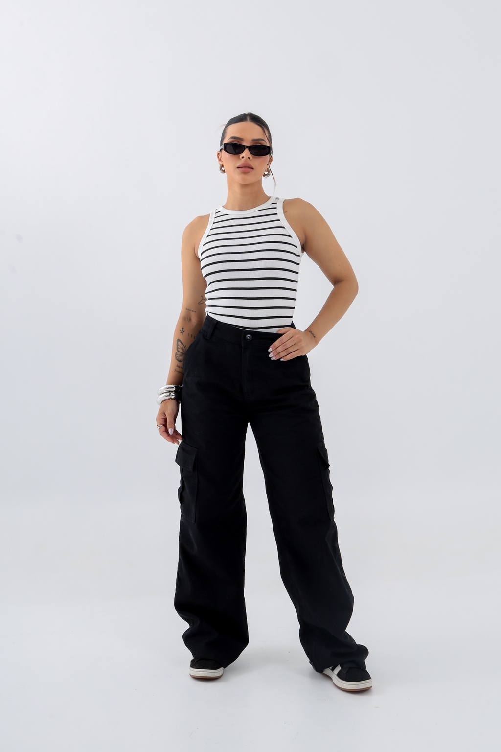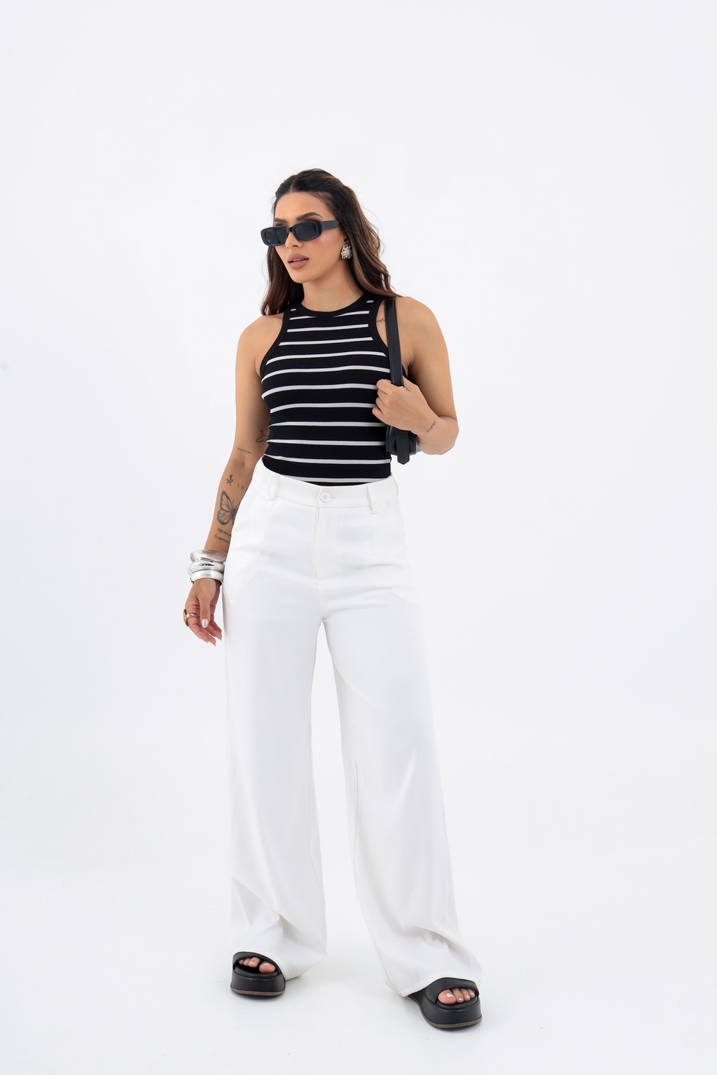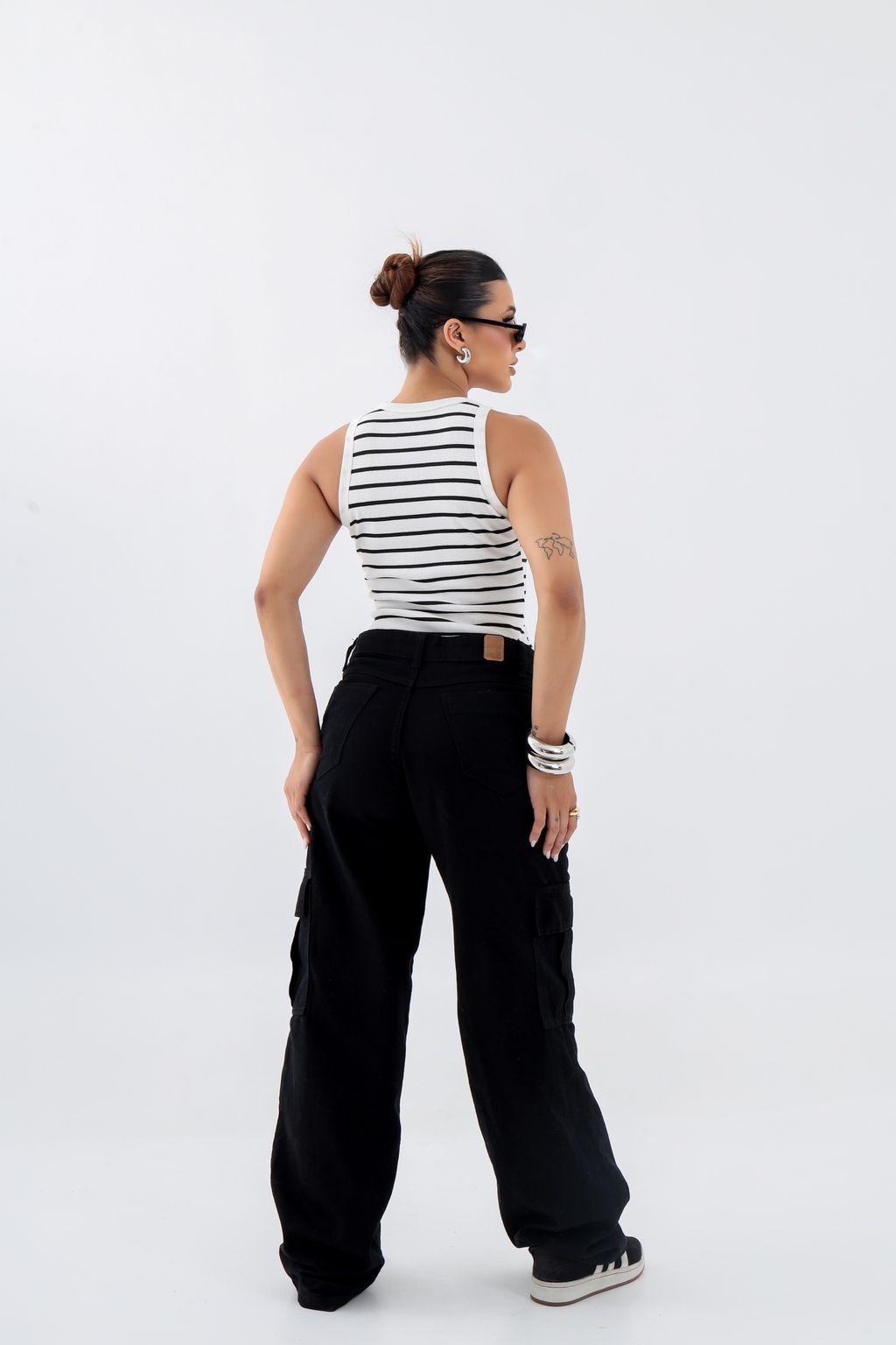 Envolva-se na elegância atemporal da Regata Listrada! Confeccionada no tecido Ribana (50% algodão, 47% poliéster, 3% elastano), este modelo em listras nunca sai de moda, proporcionando um look sofisticado e versátil para qualquer ocasião.